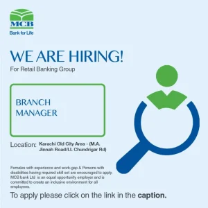 MCB Bank Limited, one of the most respected financial institutions in Pakistan, is currently hiring a Branch Manager for its Retail Banking Group. This position is based in the Old City area of Karachi, specifically near M. A. Jinnah Road and I. I. Chundrigar Road, which are major commercial hubs of the city.