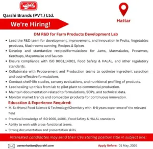If you have a strong background in food science and a passion for product innovation, this opportunity at Qarshi Brands (PVT.) Ltd. could be a great fit. The company is currently hiring for the position of Deputy Manager (DM) R&D – Farm Products Development Lab at its facility in Hattar.