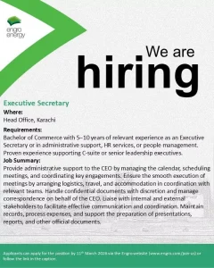 The Executive Secretary role at Engro Energy in Karachi is a high-profile position that requires experience, discretion, and organizational excellence.