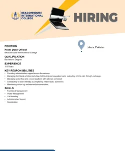 Beaconhouse International College is currently hiring a Front Desk Officer for its campus in Lahore. This role is ideal for individuals who enjoy interacting with people, managing administrative tasks, and being the first point of contact in a professional environment.