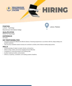 Beaconhouse International College has announced a new career opportunity for the position of Lecturer in Psychology. This role is ideal for experienced academic professionals who are passionate about teaching psychology and contributing to research and academic development.
