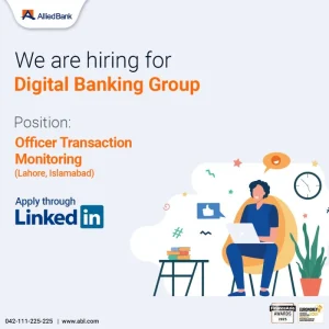 If you are looking to build a career in the banking sector, particularly in the growing field of digital banking and financial compliance, Allied Bank Limited has announced an excellent opportunity. The bank is currently hiring for the position of Officer Transaction Monitoring in its Digital Banking Group, with job locations available in Lahore and Islamabad, Pakistan.