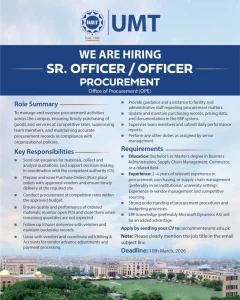 The Sr. Officer / Officer – Procurement role at UMT is an excellent opportunity for candidates with 2–4 years of procurement experience to contribute to a reputable university’s operational efficiency.