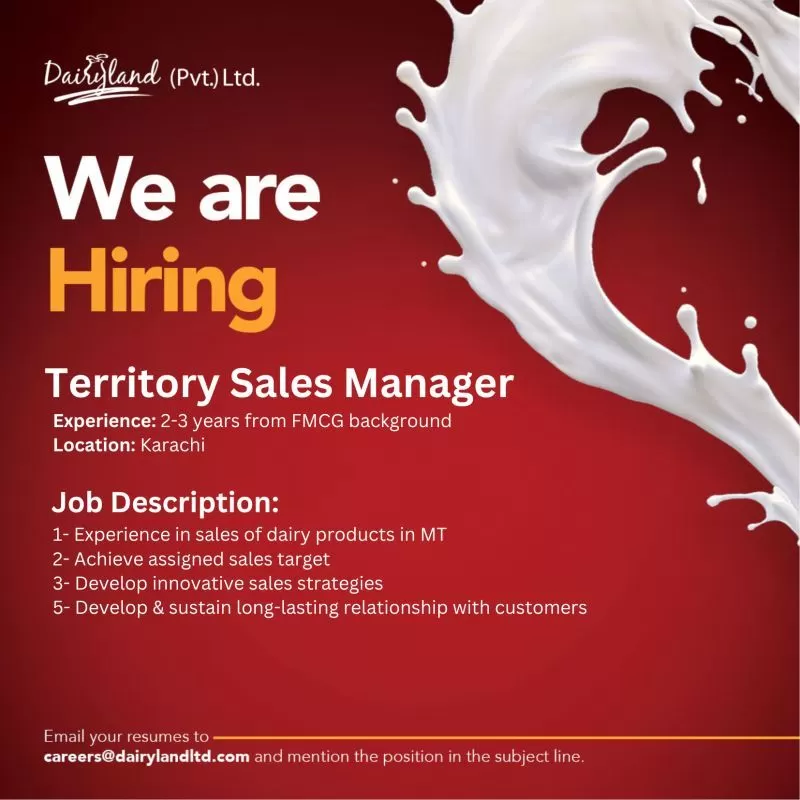 Are you a dynamic sales professional with experience in the Fast-Moving Consumer Goods (FMCG) sector, particularly in dairy products? Dairyland (Pvt.) Ltd., a leading name in the dairy industry, is seeking a talented individual to join our team as a Territory Sales Manager in Karachi. If you have 2-3 years of experience in FMCG sales and a passion for achieving targets, we invite you to explore this exciting opportunity.