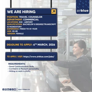 The Travel Counselor position at Airblue is an excellent opportunity for young candidates who want to enter the aviation industry. With the job based at Jinnah International Airport in Karachi, employees will gain hands-on experience in airline customer service and travel operations.